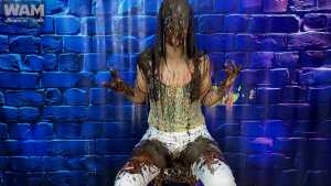 After receiving all the remaining mess from the floor again on top of her head, Patty has to throw herself to the floor and roll around, ending up completely covered from head to toe in the sticky concoction. Her long hair is ruined, and her beautiful sparkly top is unrecognizable!